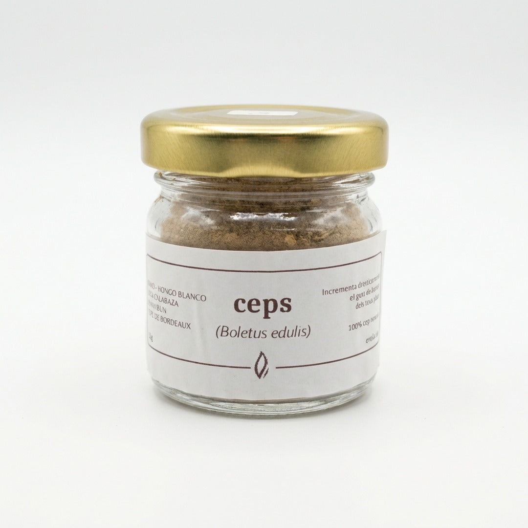 Boletus edulis (ceps) deshidratados y molidos que aportan un intenso aroma y sabor a setas.