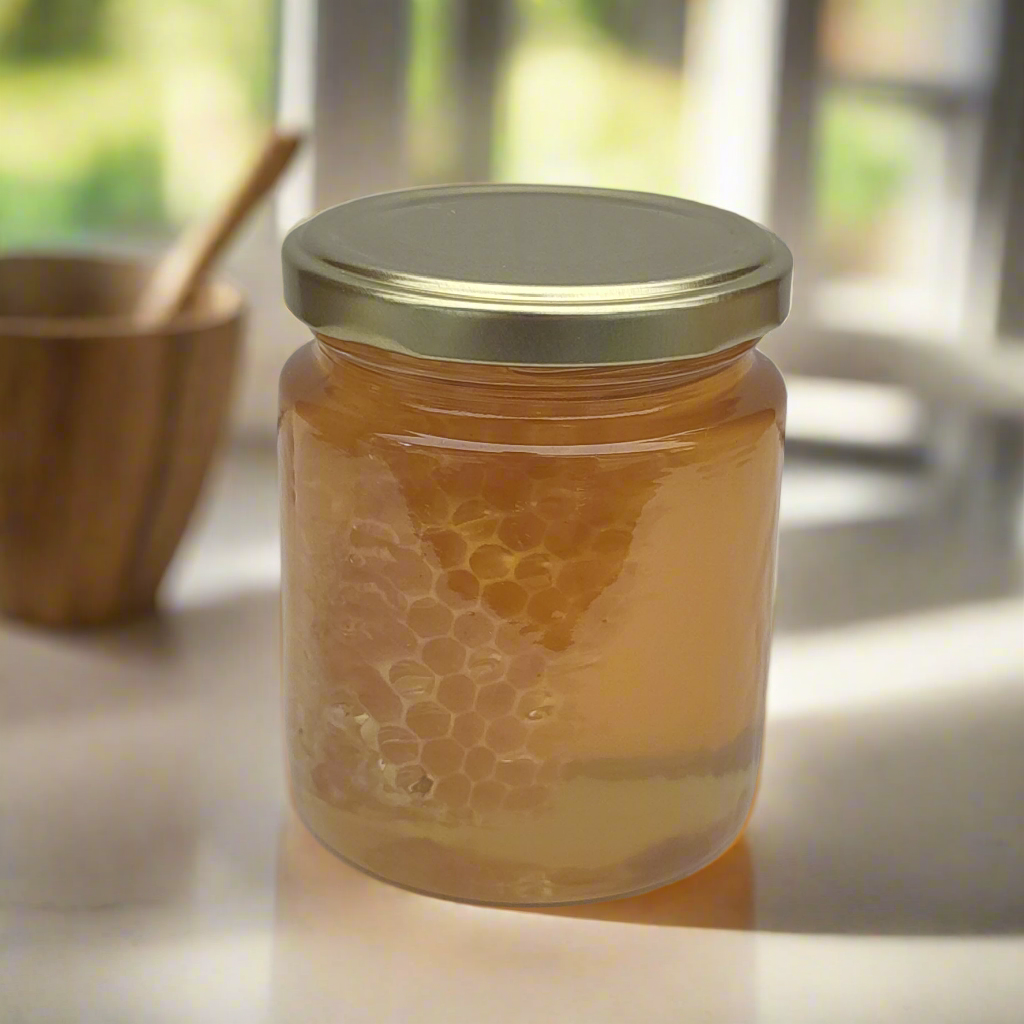 Esta presentación no es la más cómoda para consumir, pero es muy vistosa, y funciona mu bién para regalos y detalles. Aquí tiene la Miel de Romero y el Panal de Romero por separado.